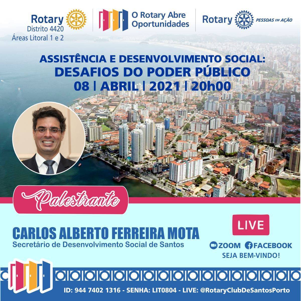 Com o tema *"ASSISTÊNCIA E DESENVOLVIMENTO SOCIAL - DESAFIOS DO PODER PÚBLICO"*, o advogado e gestor público *Carlos Alberto Ferreira Mota*, Secretário de Desenvolvimento Social de Santos/SP, será o palestrante motivador da noite.