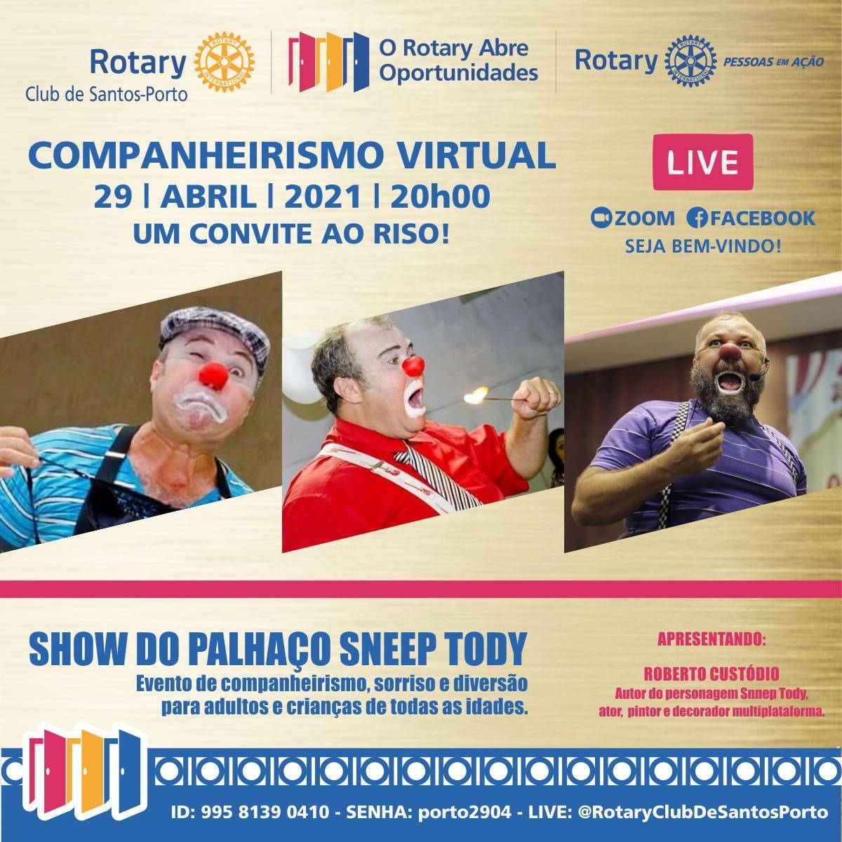 SORRIA COM O PALHAÇO SNEEP TODY - Na quinta-feira de 29 de abril de 2021, às 20h00, via plataforma Zoom e Facebook (@RotaryClubDeSantosPorto), realizaremos a 40ª Reunião Ordinária do Ano Rotário 2020-2021, em união com outros clubes de Rotary. Em pauta, um descontraído encontro de companheirismo, sorriso e diversão.