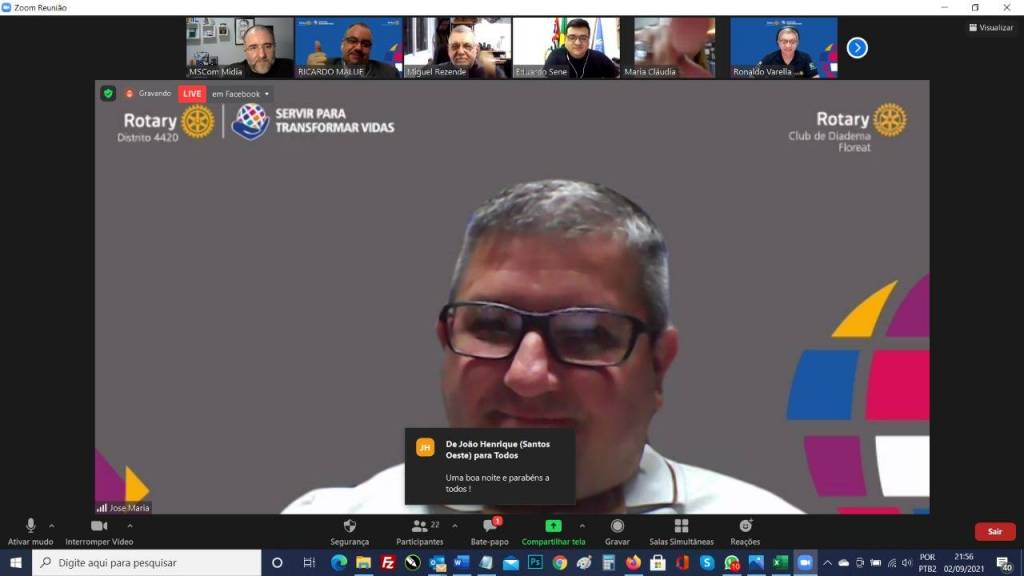 Nesta quinta-feira de 02 setembro de 2021, às 20h00, via plataforma Zoom e Facebook (@RotaryClubDeSantosPorto), realizamos a 5ª Reunião Transformadora do Ano Rotário 2021-2022.